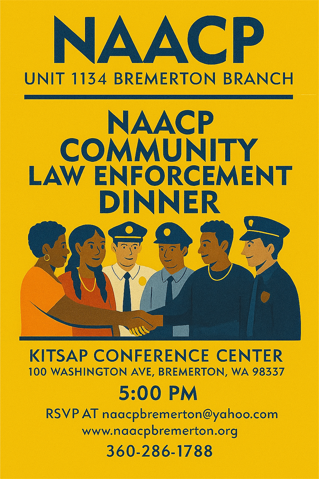 We are honored to announce NAACP Bremerton’s Annual Community and Law Enforcement Dinner, a gathering rooted in unity, dialogue, and shared commitment to racial justice. During this event we continue the power of collaboration between community members and law enforcement, and we reaffirm our collective dedication to equity, safety, trust, transparency, and accountability.